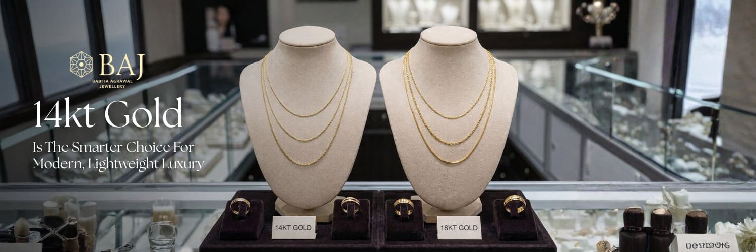 Explore our expertly crafted 14kt gold jewellery collection today and experience the smarter way to shine. Visit Babita Agrawal Jewellery or book a personalised consultation now.