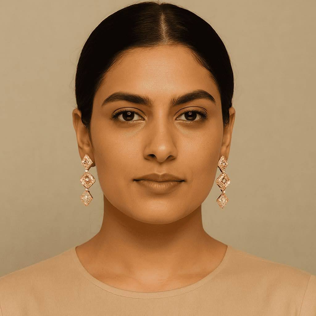Choose earrings that are neither too heavy nor too long. Go for subtle sparkle that draws attention to your eyes or lips. BAJ’s double triangle studs or custom kundan tops will work beautifully to complement a diamond-shaped face.