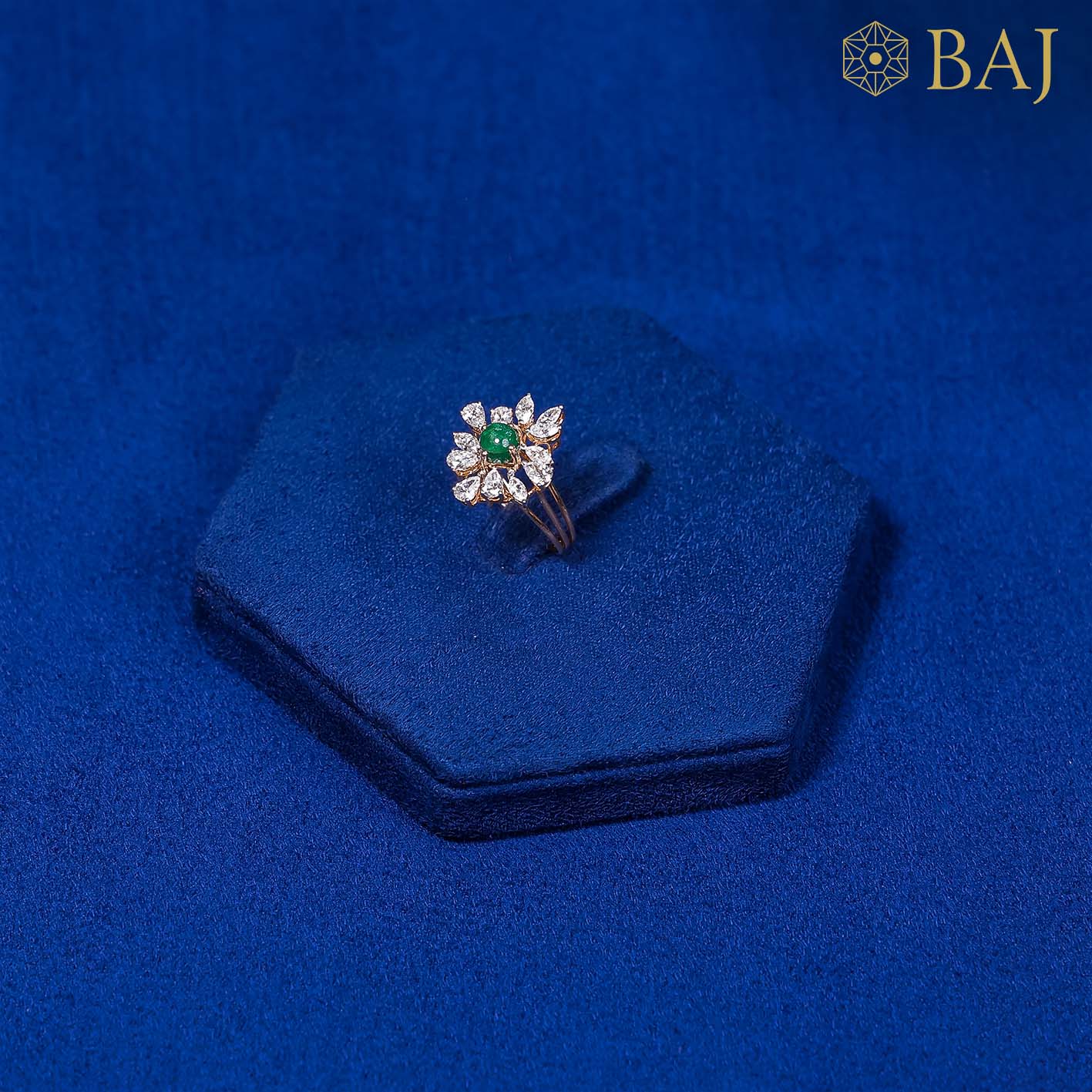 Graceful and radiant, this flower-shaped ring is crafted from a stunning arrangement of large marquise and pear-shaped diamonds, each petal sparkling with exceptional brilliance. At the heart of the floral design sits a captivating green gemstone, adding a vibrant pop of color that symbolizes growth and renewal. Set in a delicate band, this ring beautifully marries nature-inspired elegance with luxurious sparkle—perfect for those who cherish timeless beauty with a bold, colorful twist.
