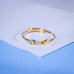 Charming 18 kt gold bangle weighing ~2.65 g, featuring a playful enamel bee and bright floral letter charms spelling “bee”. Crafted for the Kids Wear collection with BIS‑hallmarked purity, this lightweight piece combines certified safety with whimsical style. A joyful, snug-fitting accessory perfect for little pollinators to shimmer all day.