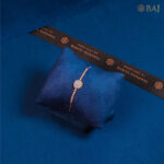 A refined 18 kt rose‑gold bracelet featuring a radiant floral motif at its center, crafted from clustered round-cut diamonds that form a brilliant blossoming profile. Extending on either side, a line of smaller bezel-set diamonds adds symmetry and sparkle. Displayed against deep blue velvet, this Light‑Wear collection piece balances effortless elegance with subtle sophistication.