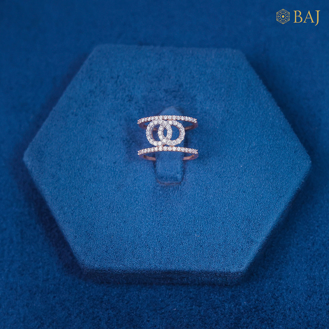 Elegant with a sculptural twist, this unique ring features two sleek diamond-encrusted bands—one above and one below—framing the design with shimmering brilliance. At the center, two interlocking twisted circles create a graceful focal point, symbolizing unity and infinite connection. The contrast between the structured diamond lines and the flowing form of the twisted circles adds depth and modern charm.