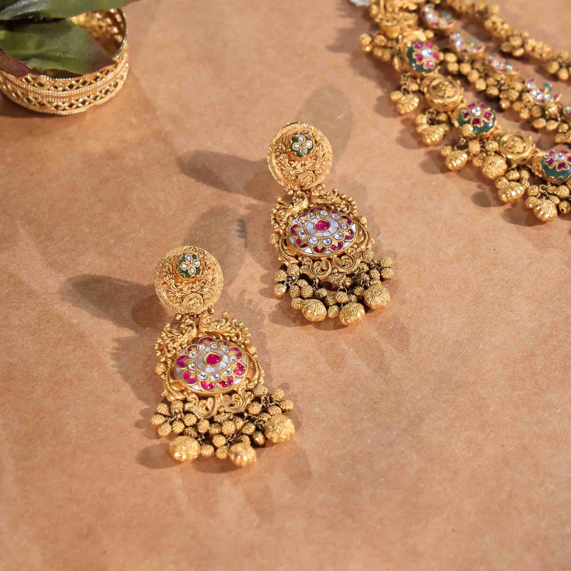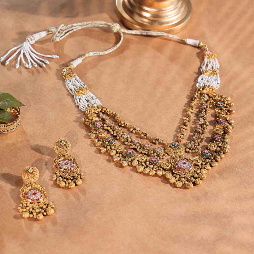Introducing the Kundan jewellery set that exudes timeless grandeur—crafted in 22 kt gold with net weight around 153.6 g, part of Babita Agrawal Jewellery’s Antique Gold collection. Featuring hand-set Kundan stones, traditional temple-inspired motifs and delicate bead fringes, this regal Kundan jewellery set is designed for bridal ceremonies and festive splendor.