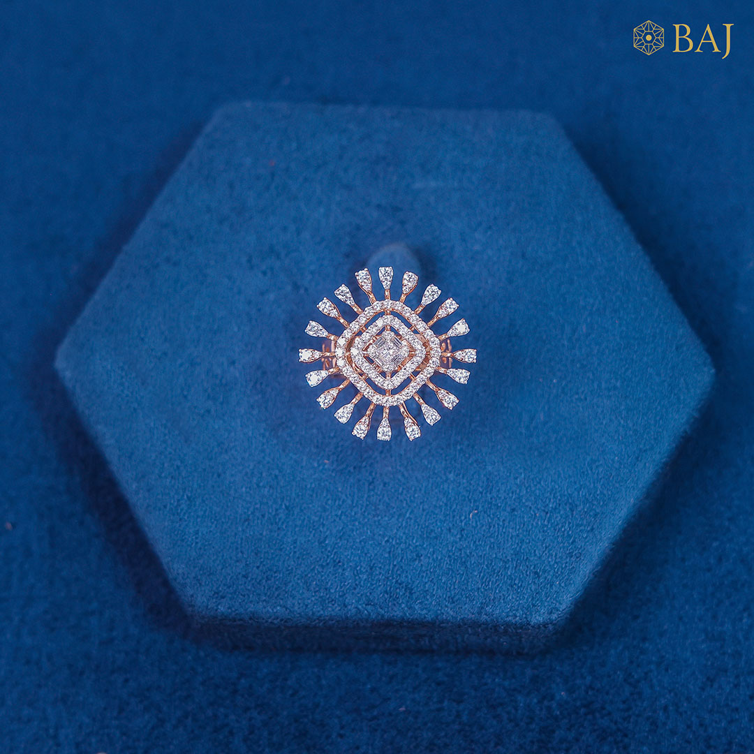 Inspired by the brilliance of a blossoming flower at sunrise, this exquisite ring features a stunning floral centerpiece from which delicate lines extend outward like sun rays. Each line is intricately adorned with sparkling small diamonds, creating a dazzling halo of light that amplifies the ring’s natural beauty. Perfect for those who love a blend of elegance and dynamic sparkle, this ring makes a bold yet graceful statement.