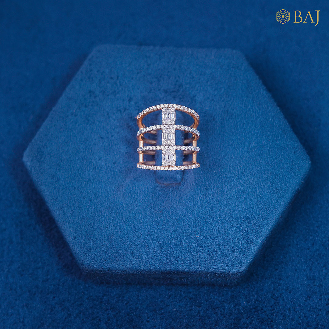 Sophisticated and modern, this four-line ring features four square diamonds gracefully nestled between the bands in a clean baguette setting. The geometric precision of the baguette cuts complements the sleek lines, creating a harmonious balance of structure and sparkle. Minimalist yet striking, this design is perfect for those who appreciate refined elegance with a contemporary edge.