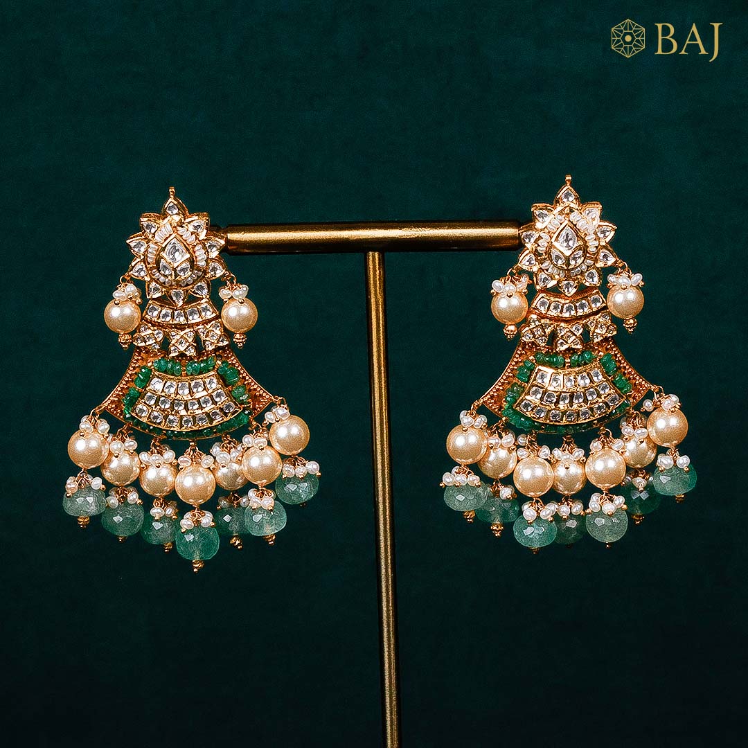 Embodying traditional grandeur, this Bikaneri kundan jewellery piece features intricate temple-inspired motifs, encrusted with dazzling diamonds, pearls, and green drops. Crafted in 22kt gold, this heavy bridal necklace is a celebration of royal Indian craftsmanship perfect for weddings and festive occasions.