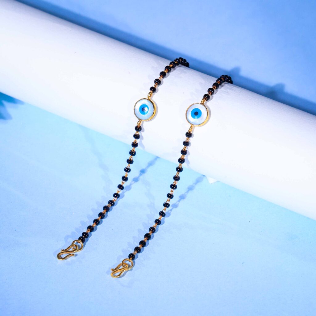 Delicate 18 kt gold kids’ bracelet weighing ~3.71 g, featuring a striking enamel evil‑eye charm alongside lustrous black bead accents. Part of the Kids Wear collection, this BIS‑hallmarked piece blends certified purity with protective symbolism. Lightweight and adjustable, it’s perfect for little wrists needing playful charm and subtle safeguard.