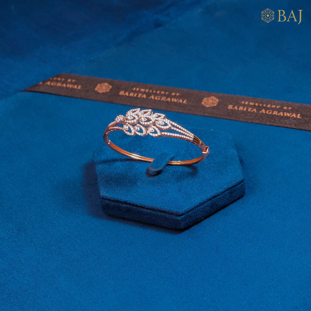 Grace your wrist with Leaf Charm, a nature-inspired rose gold kada featuring delicately arranged diamond leaves. Designed for effortless elegance, it blends sophistication with comfort. A timeless choice among bangles in diamond, this piece adds refined sparkle to both festive and everyday looks.