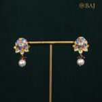 Add a pop of color with these vibrant polki diamond earrings crafted in 18kt gold. Featuring multicolour enamel lotus motifs and a delicate pearl drop, they blend traditional elegance with playful charm. Perfect for festive occasions or ethnic day looks that need a stylish upgrade.