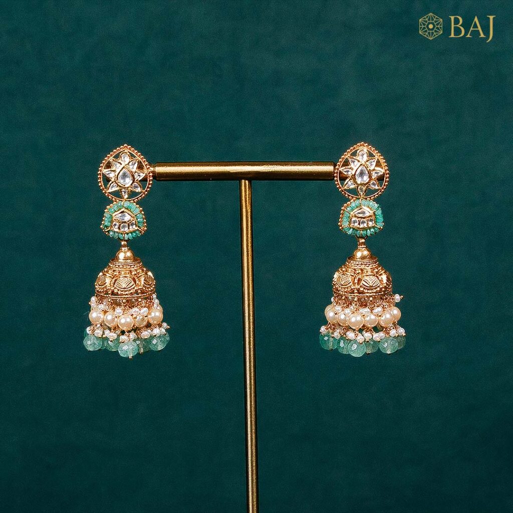 This regal Bikaneri kundan jewellery set showcases a dazzling choker adorned with pearls, green beads, and crescent motifs. Crafted in 22kt gold with intricate polki detailing, this handcrafted masterpiece is perfect for brides seeking timeless elegance steeped in Rajasthani heritage.