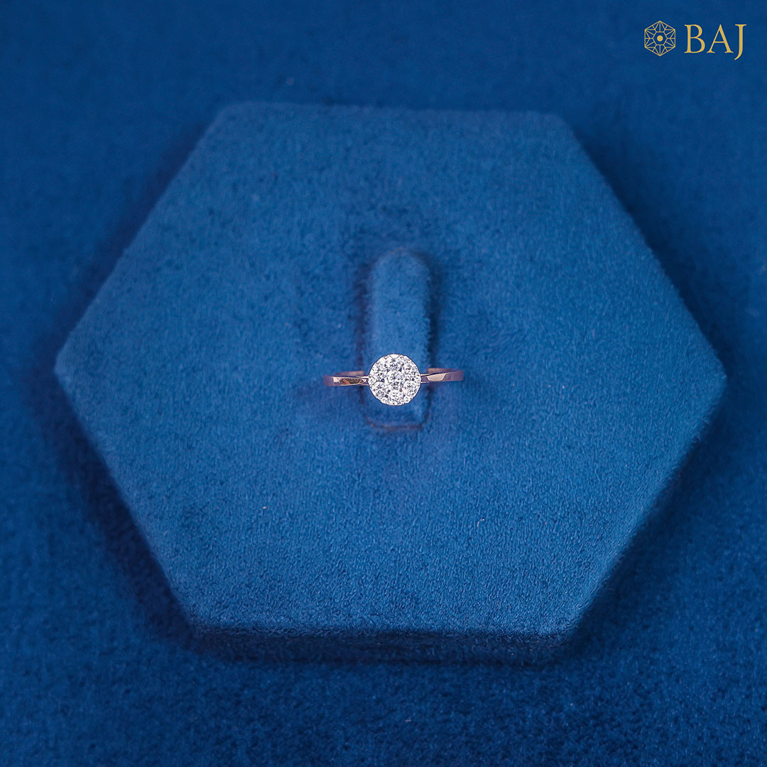 Timeless elegance meets radiant sparkle in this rose gold band, crowned with a dazzling circle of diamonds in a cluster setting. The closely set stones create the illusion of a single, brilliant gem that captures and reflects light beautifully from every angle. The warm glow of the rose gold perfectly complements the shimmering diamonds, making this ring a delicate yet striking symbol of grace and sophistication.