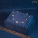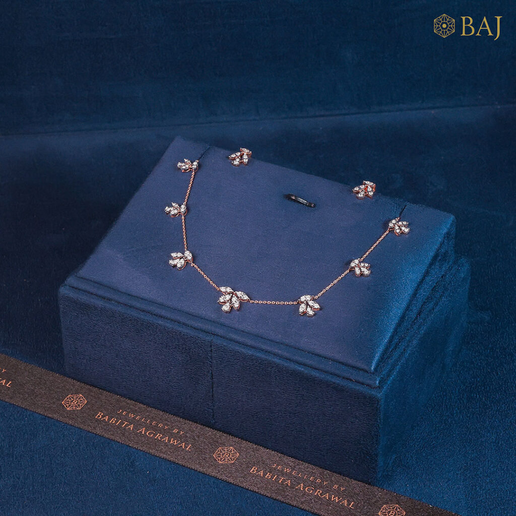Delicately designed in 18kt gold, this floral diamond necklace set is a celebration of grace and lightness. Featuring 0.9ct of brilliant diamonds, it’s ideal for women seeking effortless beauty in everyday elegance. A subtle yet striking choice for modern occasions.