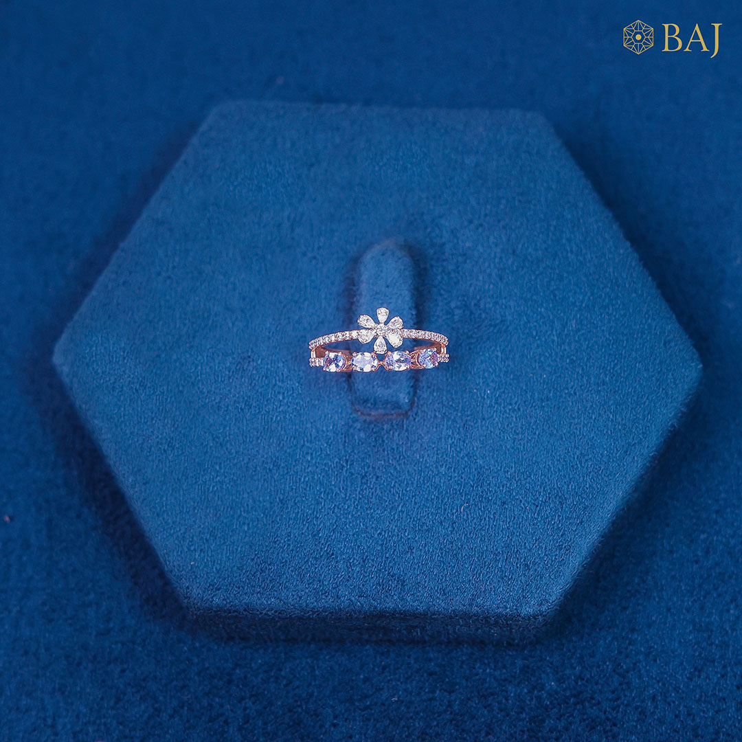 This enchanting ring combines nature’s beauty with regal elegance. At the top, a tiny, delicate flower blooms gracefully, crafted with intricate detail and surrounded by a band of sparkling tiny diamonds. Below, three vibrant amethyst stones rest side by side, their rich purple hues perfectly complemented by a slender diamond-studded band that wraps gently around them. This harmonious blend of floral charm and radiant gemstones creates a unique, captivating piece—perfect for those who appreciate subtle artistry and vibrant color.