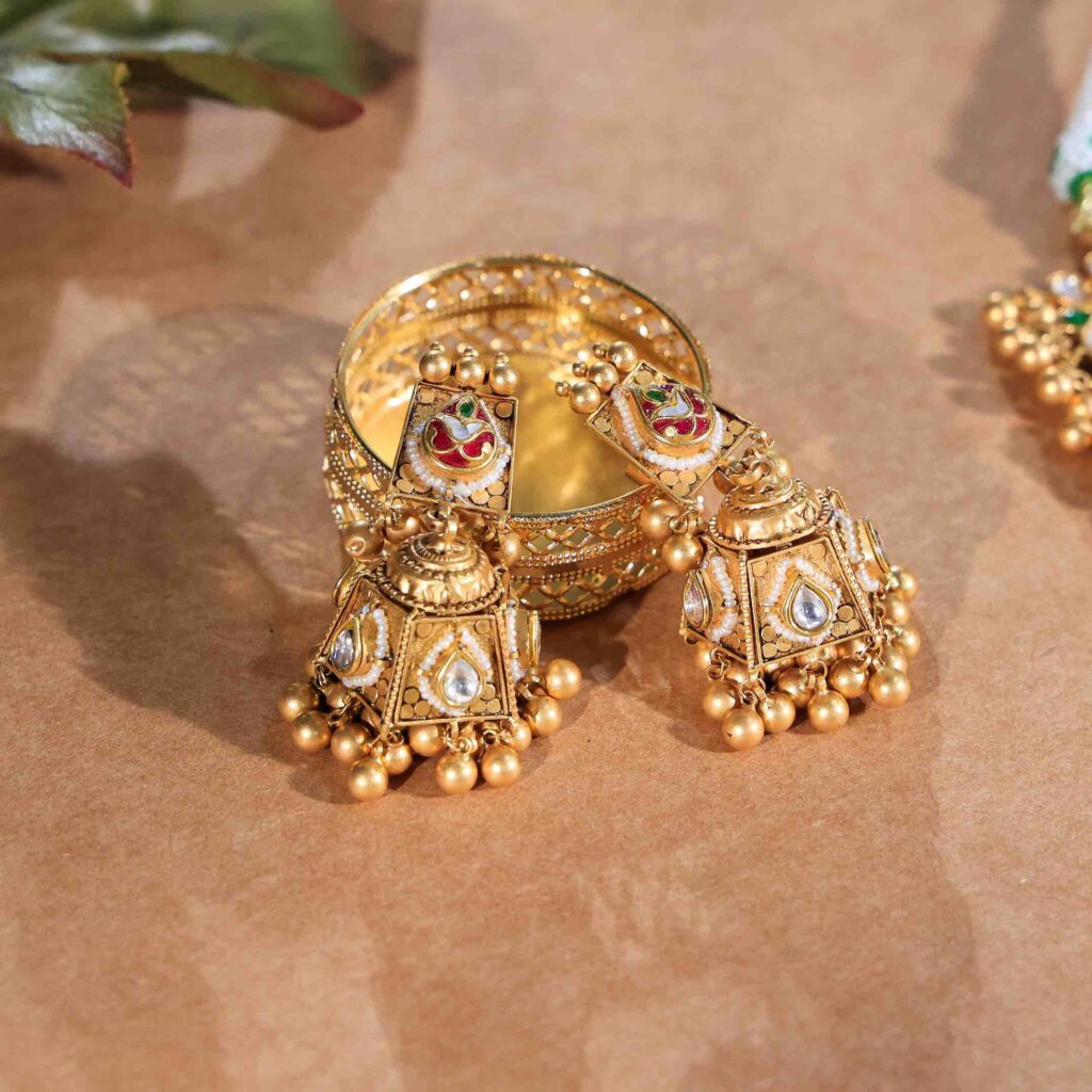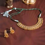 Elevate your bridal ensemble with this heritage-inspired Kundan jewellery set from Babita Agrawal Jewellery’s Antique Gold collection. The regal crescent-shaped necklace and matching earrings feature hand-set Kundan stones framed in antique temple motifs, with delicate gold bead fringe. With a net weight of ~105.6 g and hallmark 22 kt purity, this set marries tradition and grandeur—perfect for weddings and festive occasions.