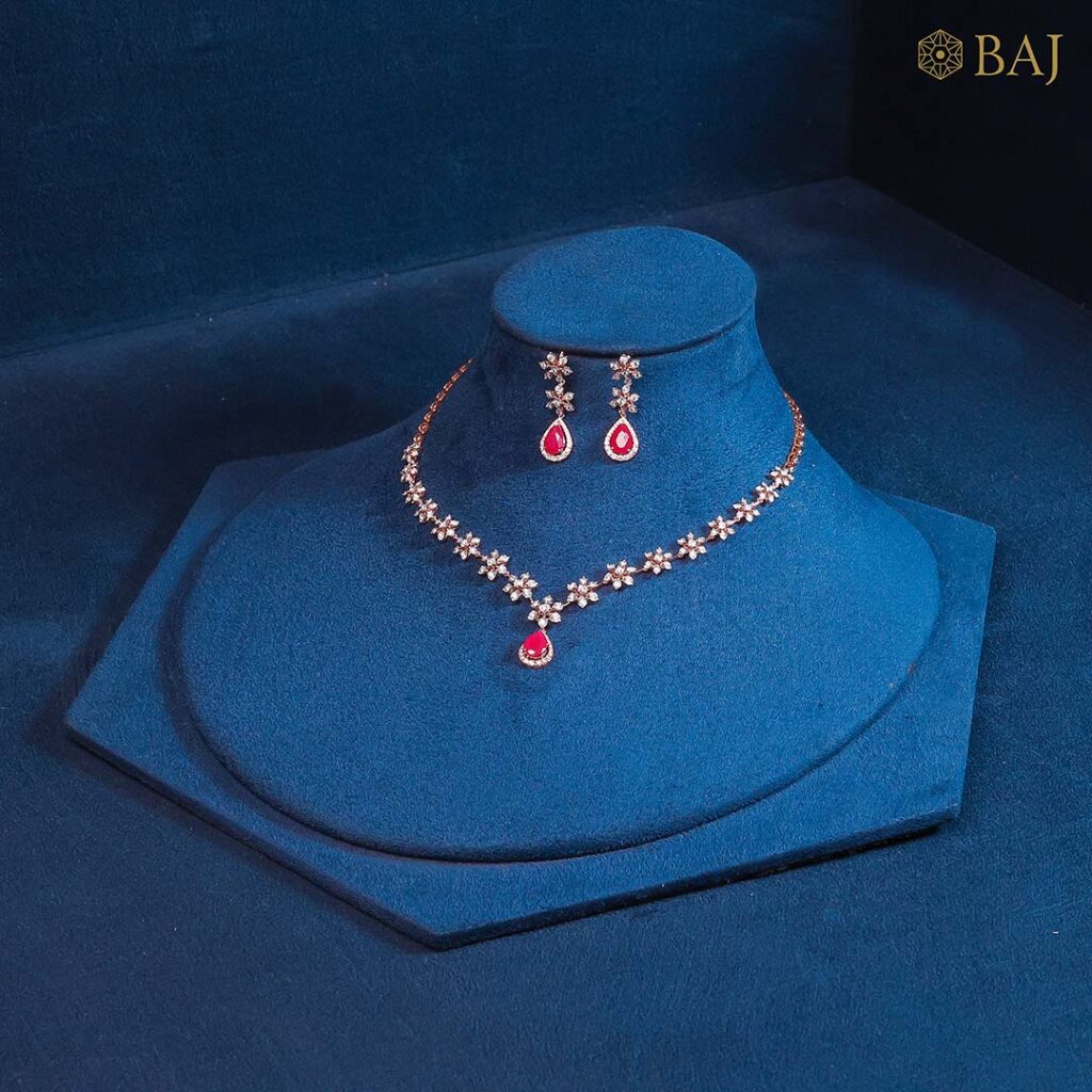 Delicately crafted in 18kt gold, this diamond necklace set features 2.49 carats of diamonds and pear-shaped ruby drops. The soft floral design adds feminine grace, making it ideal for festive gatherings or gifting. A charming diamond necklace set that blends elegance with a pop of color.