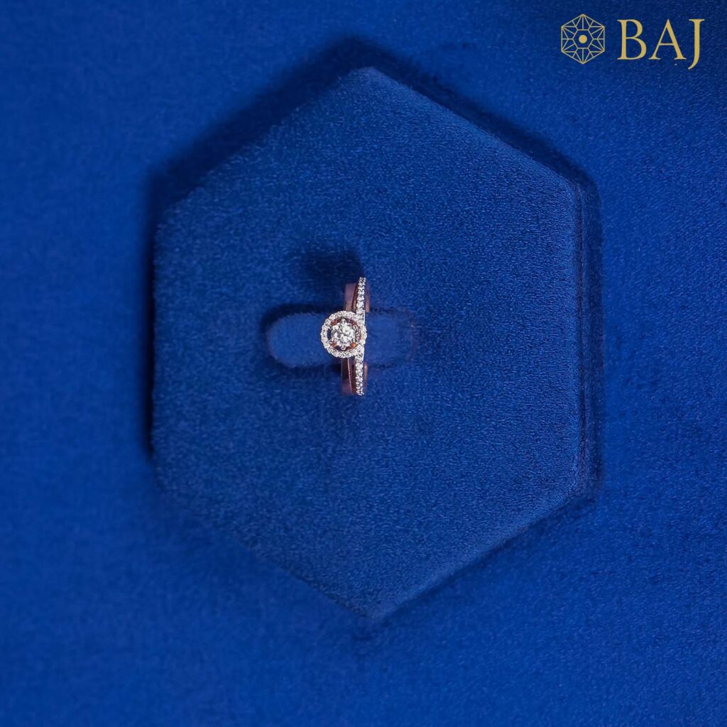 This exquisite ring features a harmonious contrast between two bands—one slender and delicately paved with shimmering diamonds, the other smooth and polished for understated elegance. At the center, a stunning pop-up diamond takes the spotlight, surrounded by a radiant halo of smaller diamonds that amplify its brilliance. The layered design balances subtlety with sparkle, creating a timeless piece perfect for any occasion.