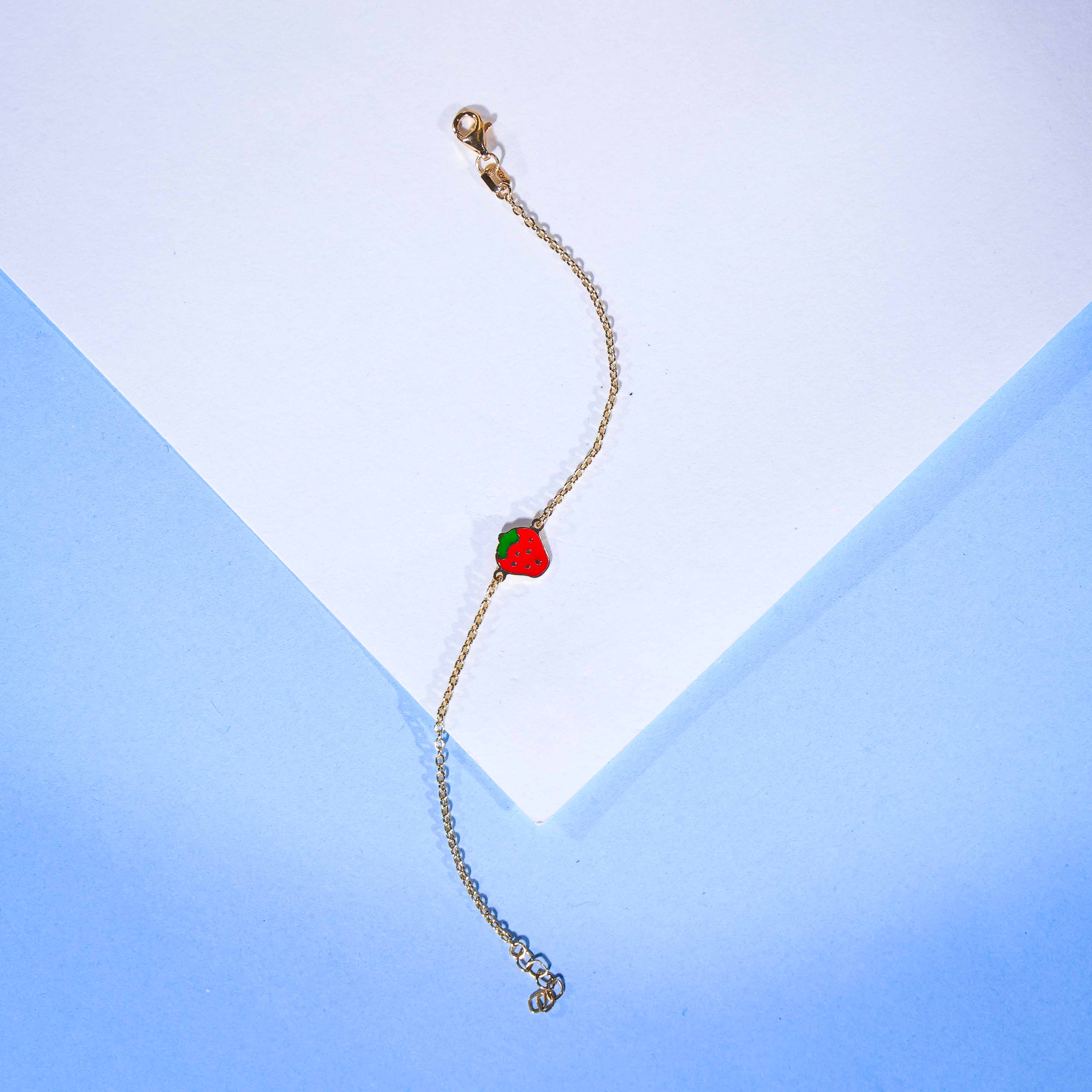 Charming 18 kt gold bracelet weighing ~1.59 g, featuring a vibrant red enamel strawberry charm on a delicate chain—crafted for the “Kids Wear” collection. BIS‑hallmarked for certified purity, this lightweight bracelet blends safety with playful delight. A perfect accessory that adds a dash of fruity fun to little wrists.
