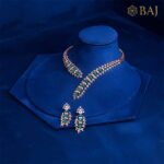 A luxurious 18kt diamond necklace set featuring 5.09 carats of sparkling diamonds and a rich array of emeralds arranged in a refined V-cut silhouette. With its structured drop and coordinated earrings, this set is perfect for glamorous functions. A dramatic diamond necklace set with regal poise.