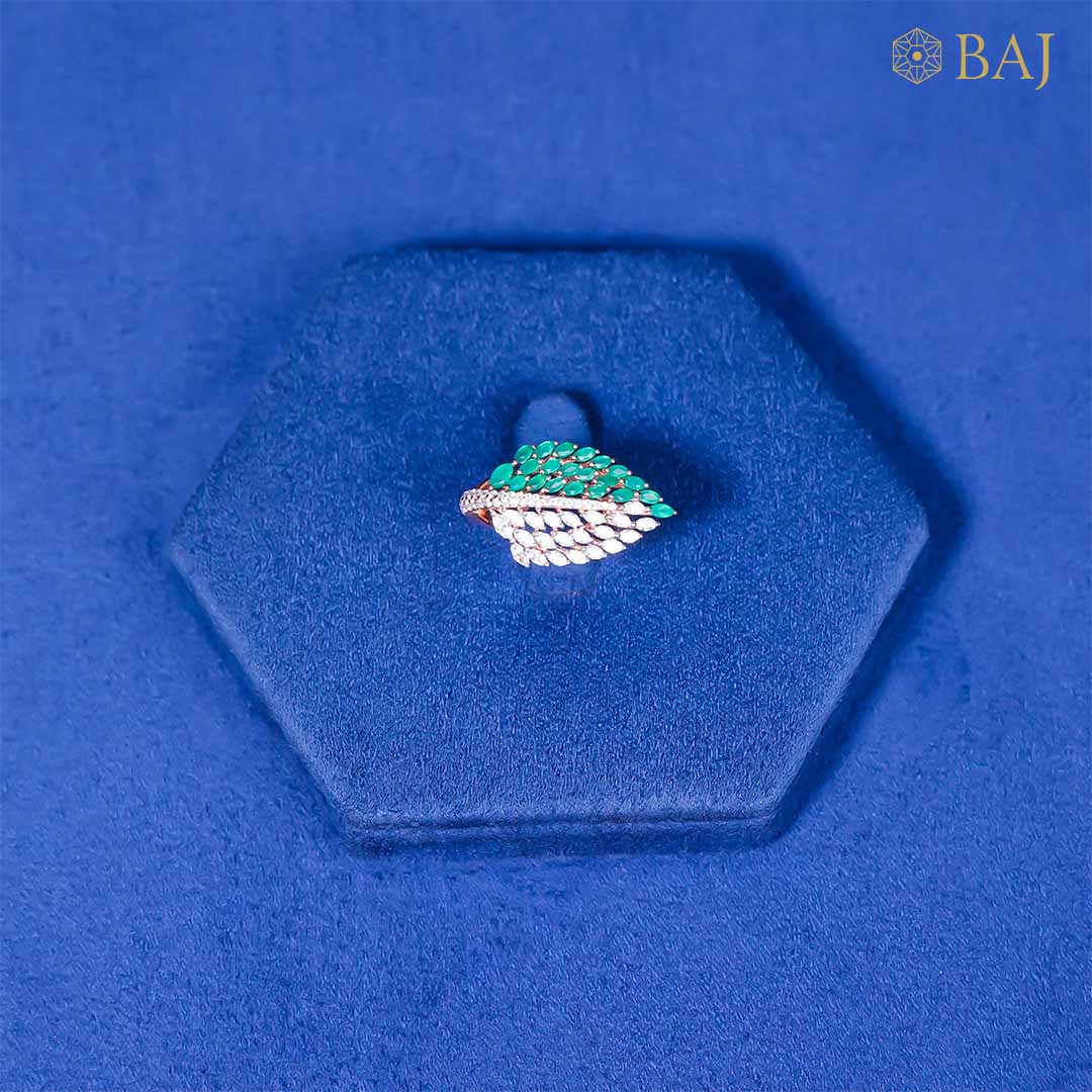 Elegant and eye-catching, this horizontal leaf-shaped ring beautifully captures the harmony of contrast and color. The leaf design is split into two graceful halves—one side adorned with shimmering white diamonds that radiate brilliance, and the other set with rich green stones that evoke the vibrancy of nature. Set in a sleek band, this piece offers a perfect balance of sparkle and serenity, making it a symbol of renewal, growth, and timeless beauty.
