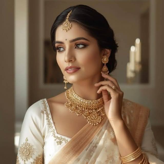 Designers are creating bridal wear with gold embroidery, pearl detailing, and handwork that pairs naturally with gold jewellery. The overall effect is elegant and refined. Many brides find that while white gold can look sharp, cool-toned yellow gold(heritage or antique polish)delivers a softer and more luxurious finish that photographs beautifully.